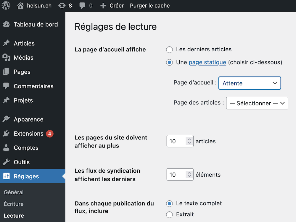 10. Réglages/ Lecture/ Page statique/ sélectionner la nouvelle page créée