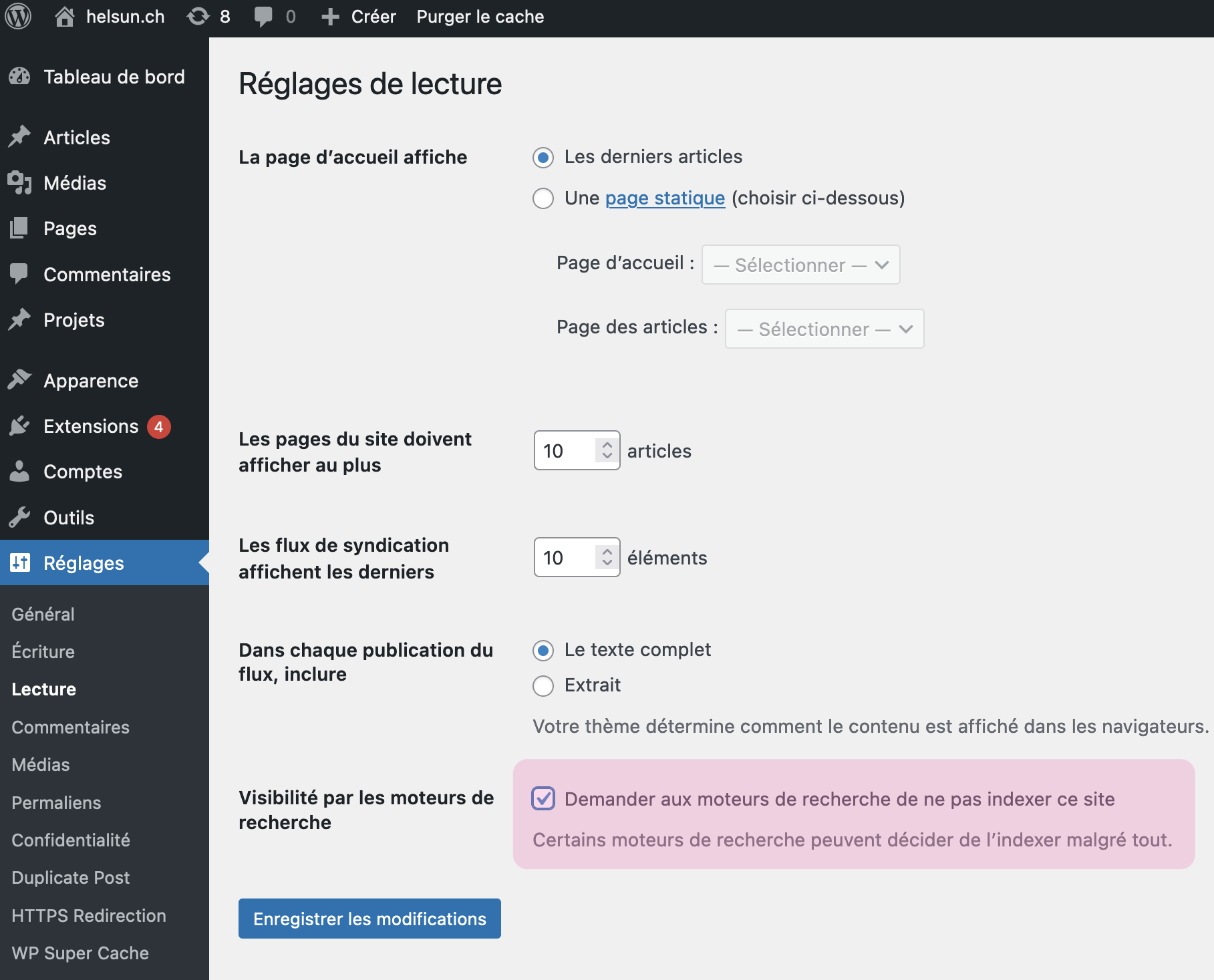 2. Réglages/ Lecture/ Décocher: demander aux moteurs de recherche de ne pas indexer le site