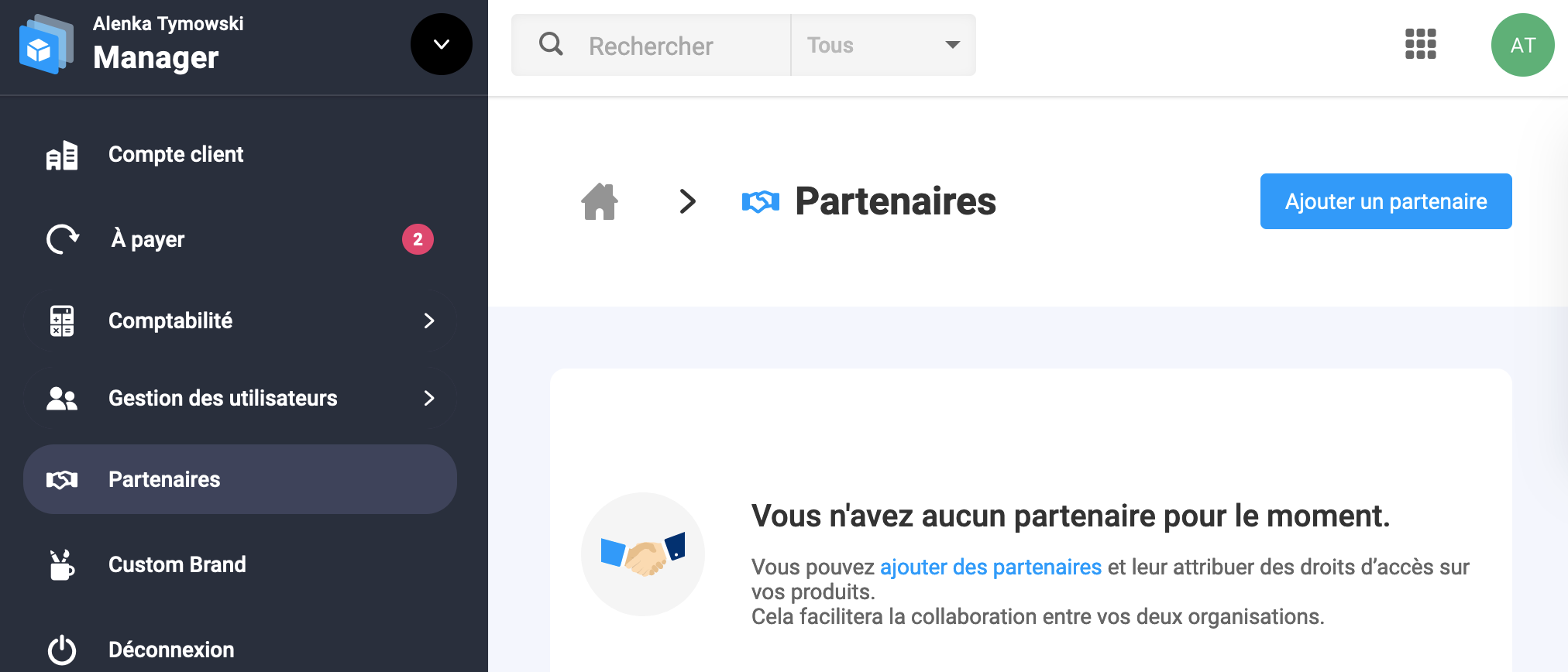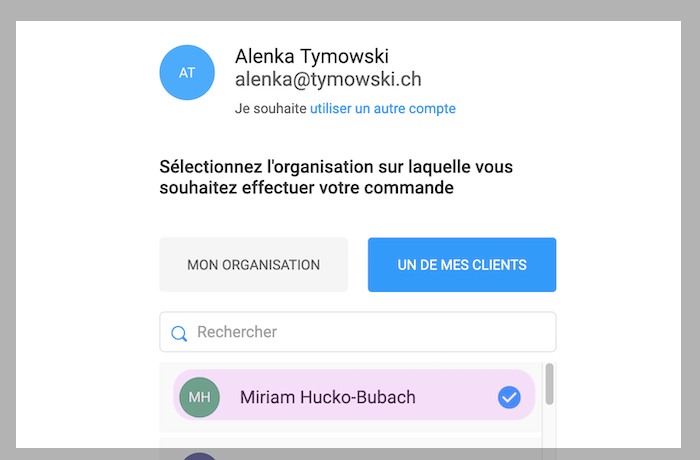 Menu de gauche…/ Partenaires/ Ajouter un partenaire (bouton bleu)/ Al&JE (contact@alejeweb.ch) et vous donnez tous les droits + paiement par le mode de paiement du client.