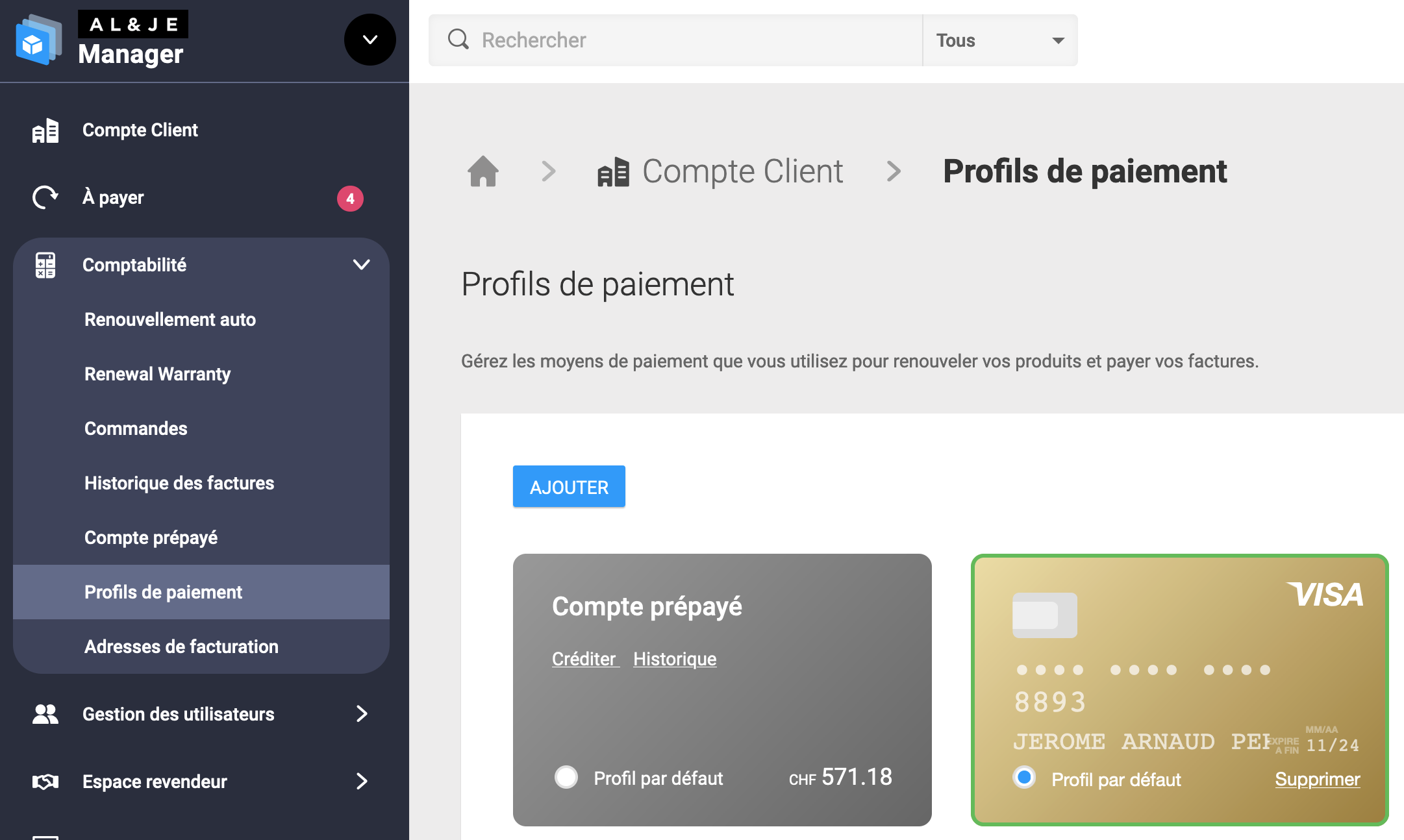 Menu de gauche…/ Comptabilité/ Profils de paiement/ Ajouter (bouton bleu) / entrer votre moyen de paiement