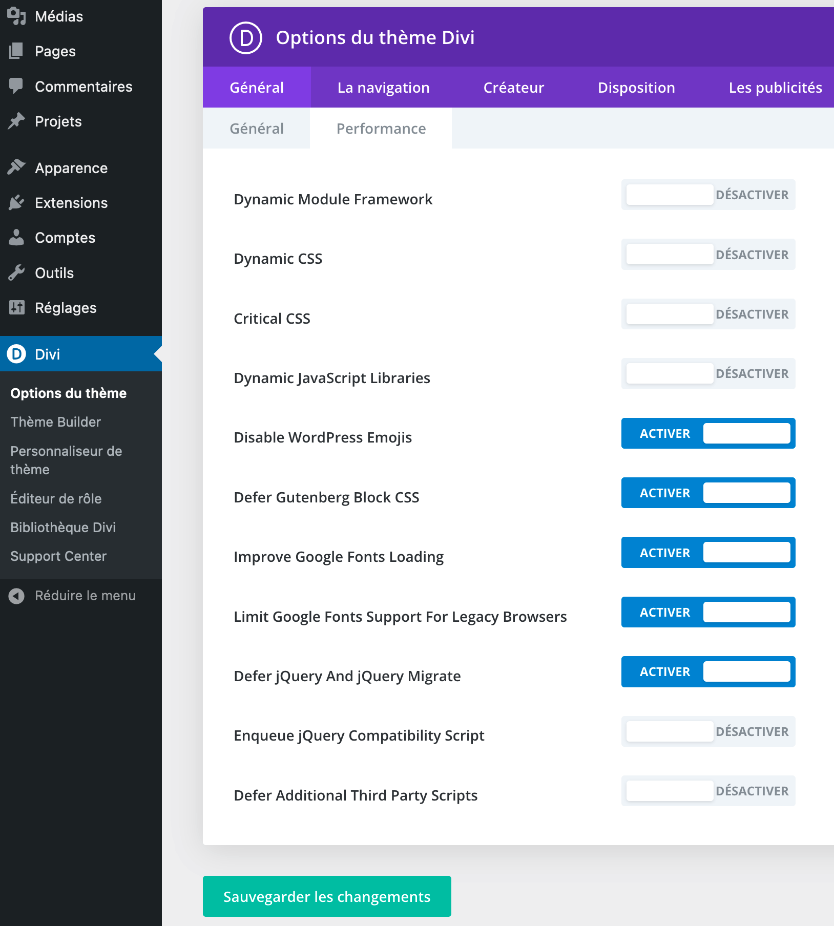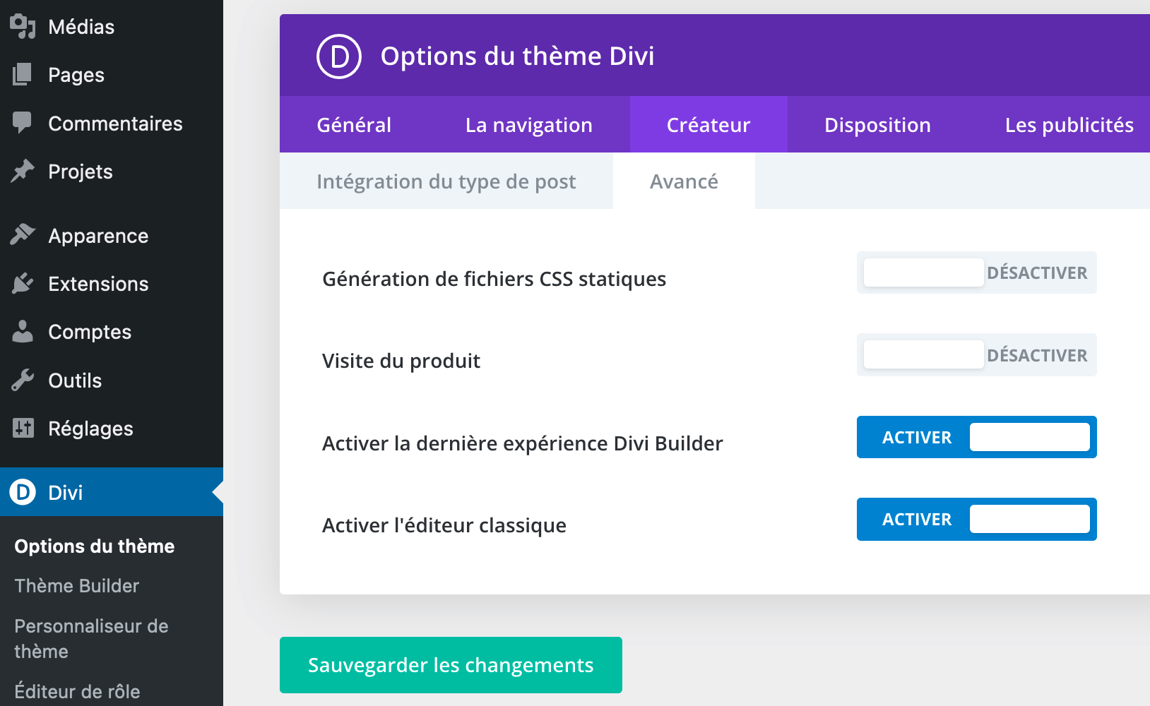 7. Divi/ Option du thème/ Créateur/ Avancé