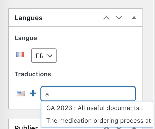Depuis l’article ou la page, cliquer sur le + et saisir le nom de l’article ou page. Si le nom n’apparait pas dans la liste, la taper soi-même.