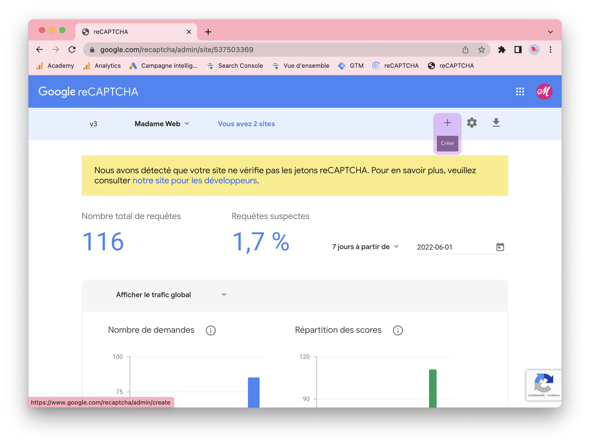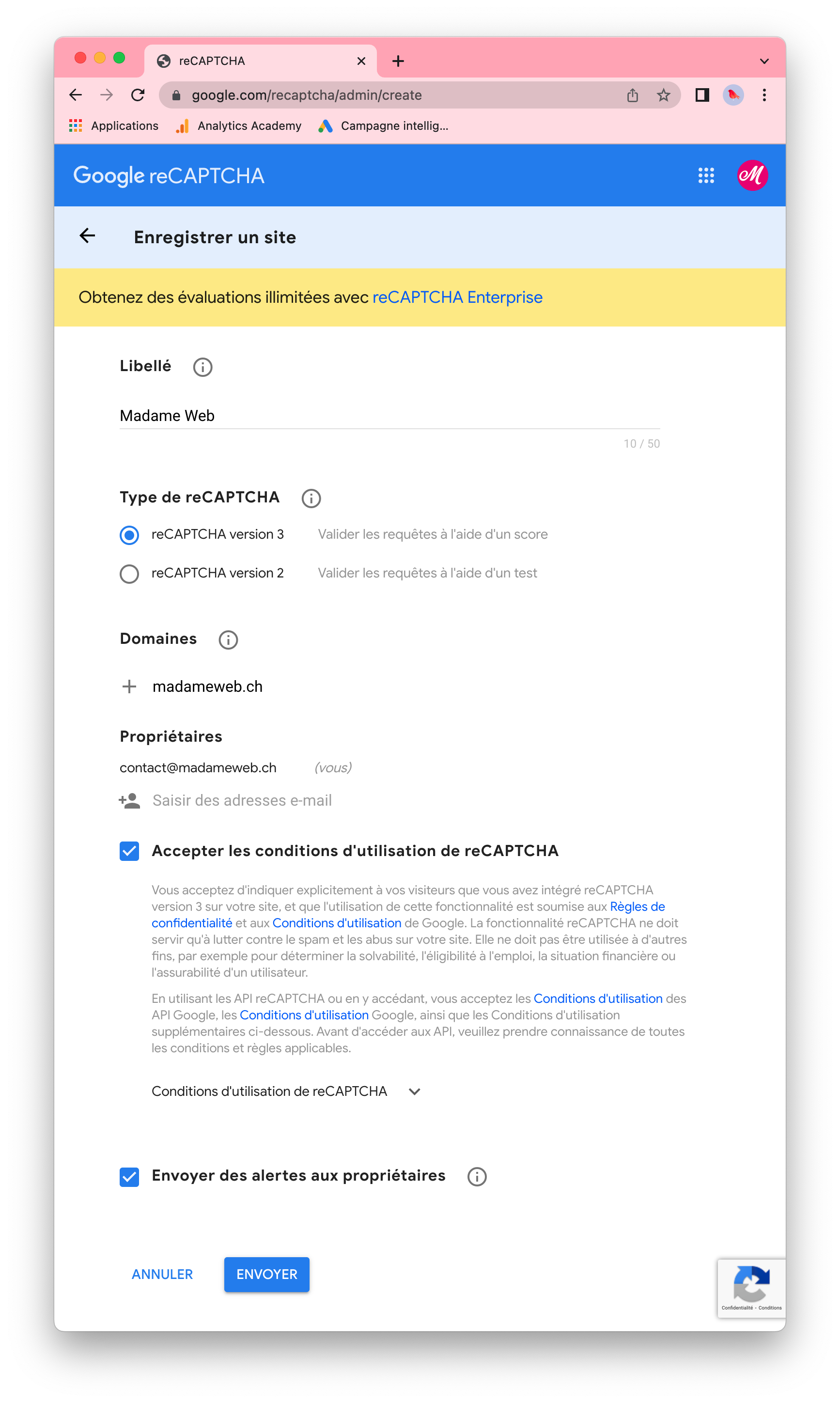 1. reCAPTCHA Google/ créer une nouvelle clé