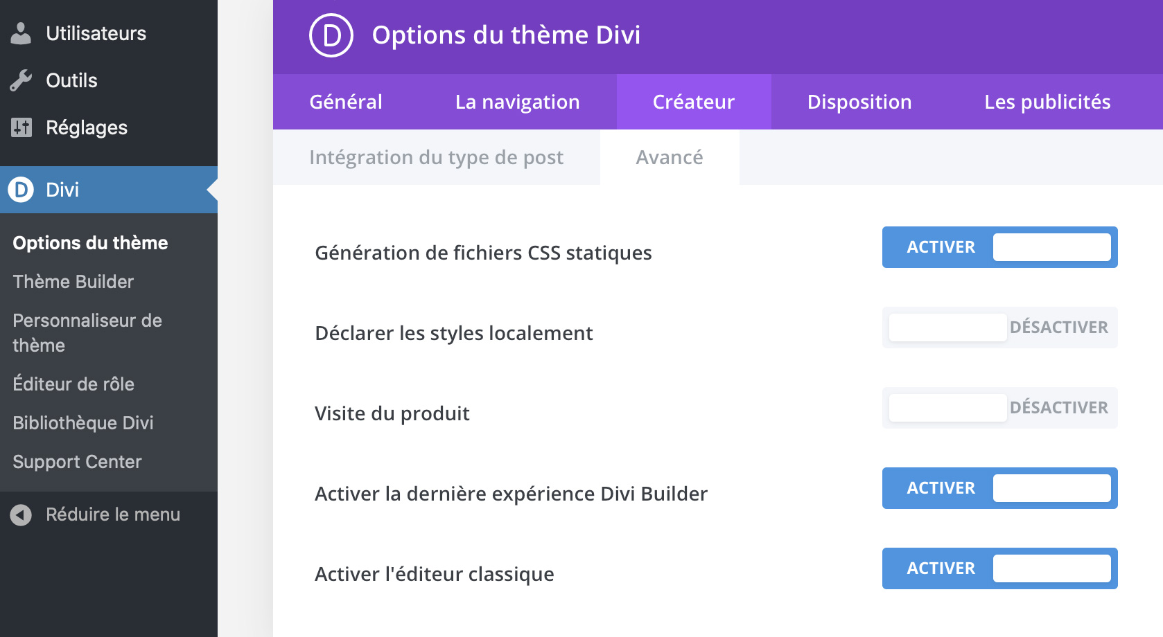 Divi/ options du thème/ Créateur/ Avancé/ … Activer l’éditeur classique -> ACTIVER